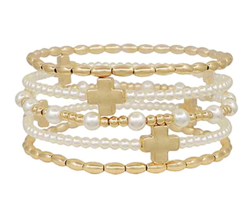 Gold Beaded Stretch Bracelet with Pearl Dotted Cross and Crystal Charms