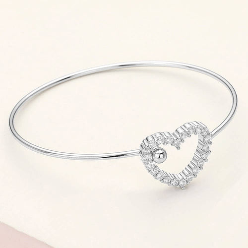 CZ Stone Paved Open Heart Accented Bangle Bracelet : Silver