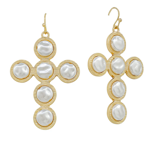 Gold Flat Coin Pearl 1.5" Cross Earring