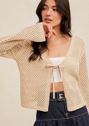 / FRONT TIE CROCHET SWEATER KNIT CARDIGAN