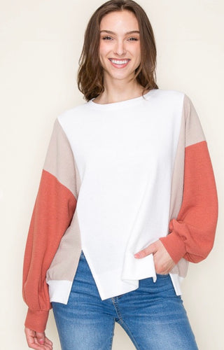 KNIT COLOR BLOCK ROUND NECK L/S TOP