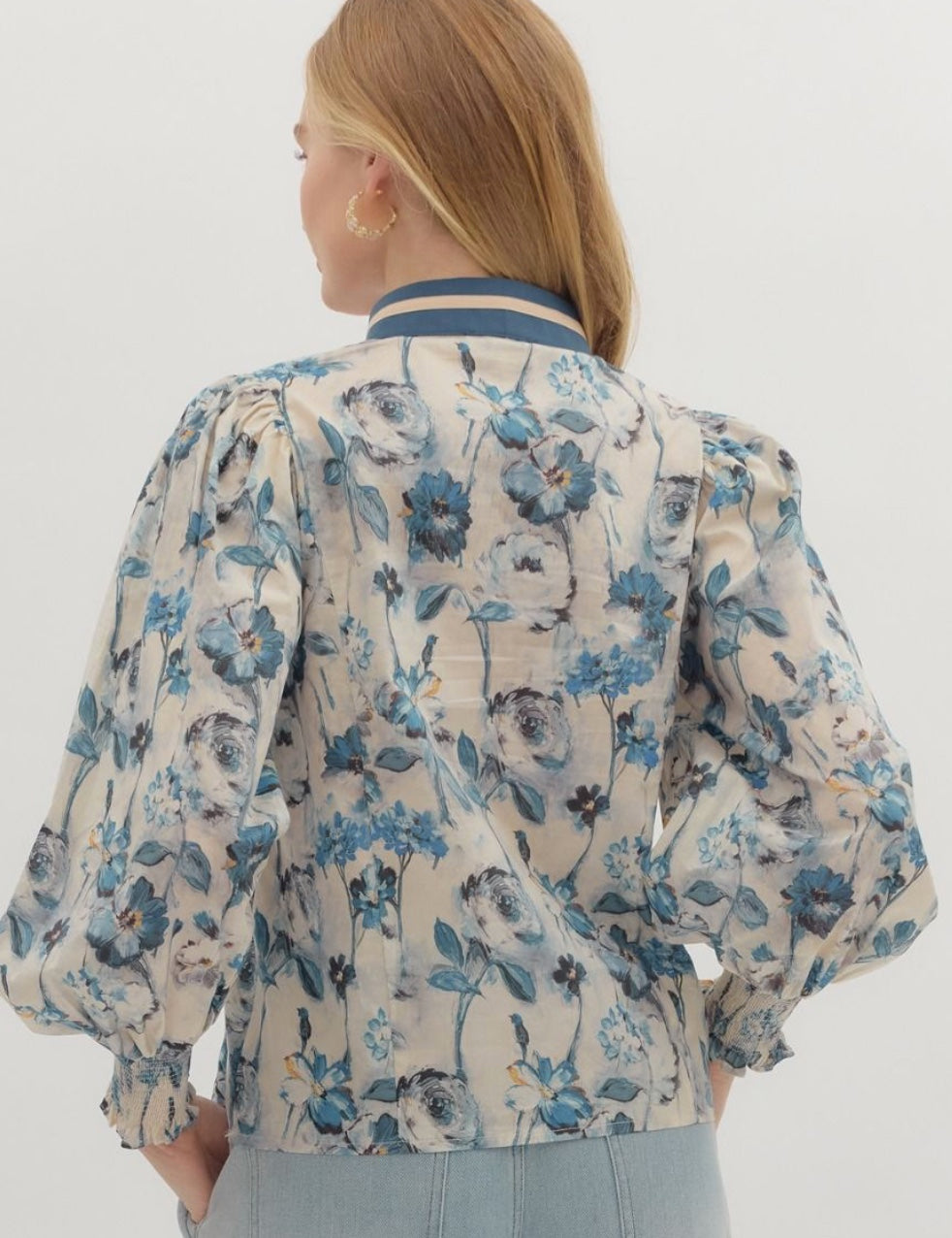 Floral pattern smocked cuff long sleeve top featuing multicolor band collar V-neck. Unlined. Woven. Non-sheer. Lightweight.