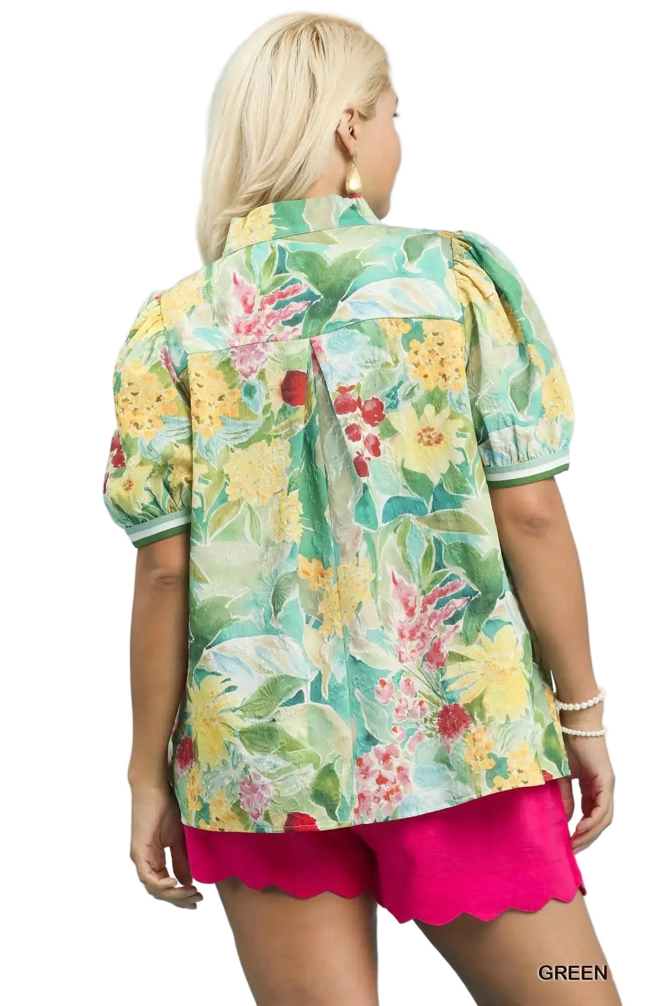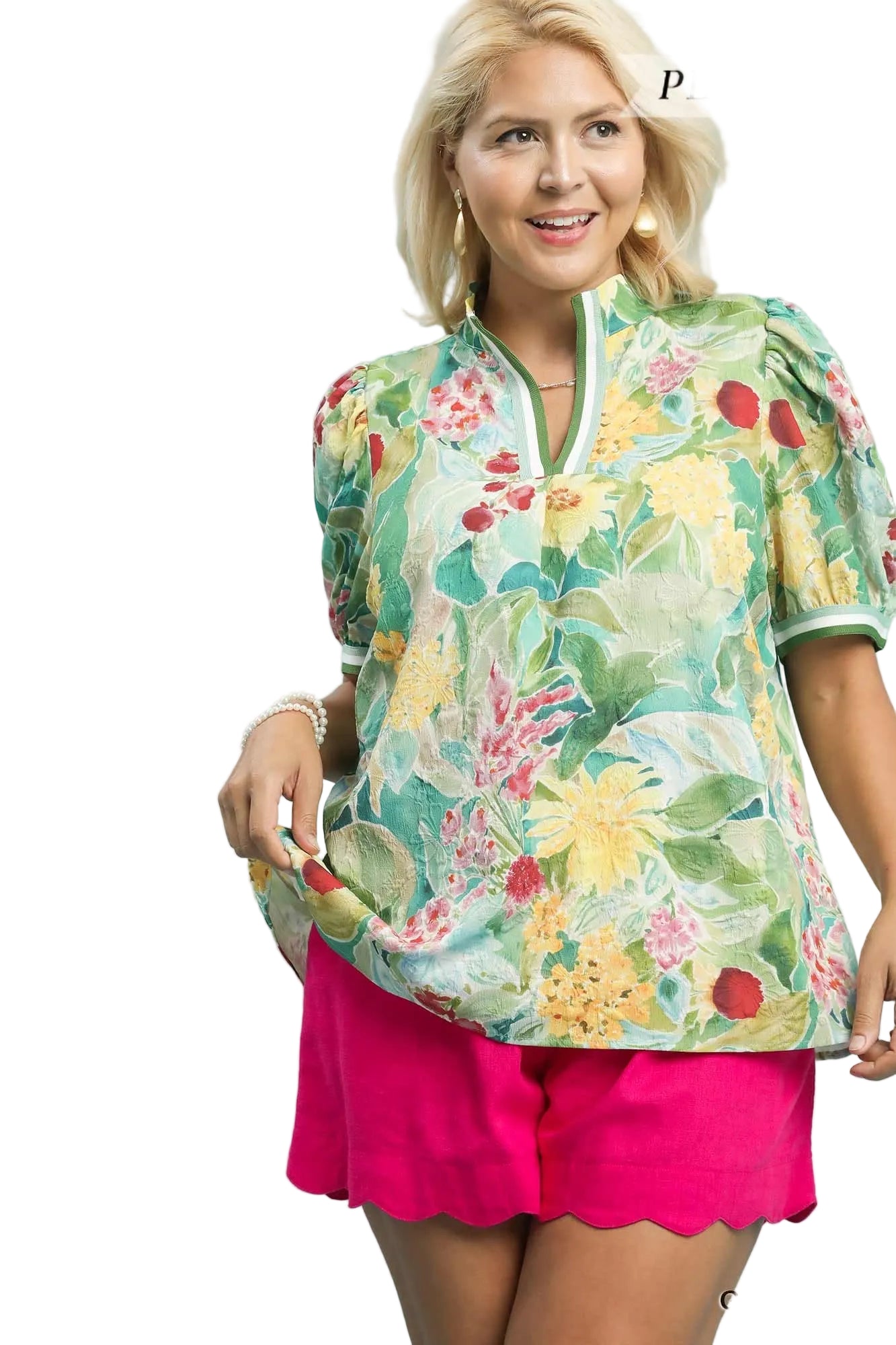 Jacquard • V-neckline with striped contrast trim• Short puff sleeves with striped contrast cuffs • Not Lined