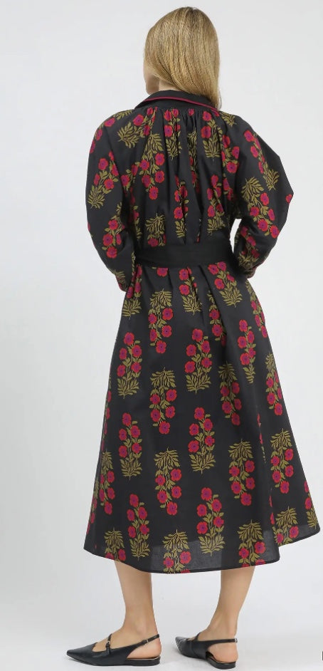 Button-down front• Collared neckline• Self-tie waist belt• 3/4 sleeves with button cuffs• Lined