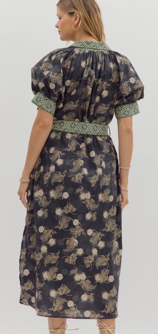Floral short puff sleeve shirt midi dress featuring contrast accent band and collar button closure at front. Removable belt. Side pockets. Lined. Woven. Non-sheer. Lightweight.