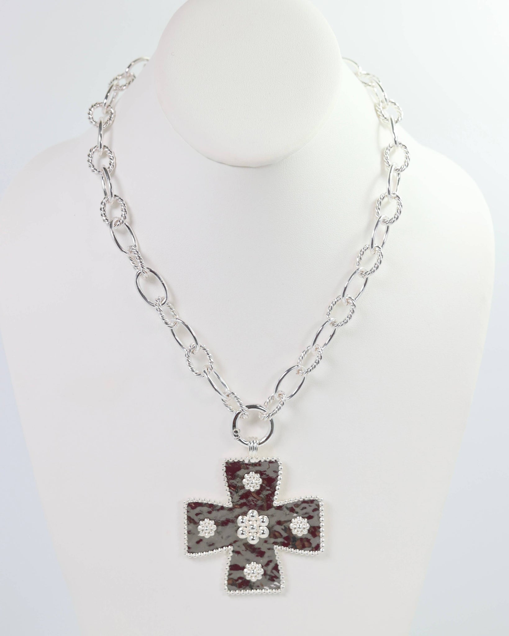 Make a statement with the Carol Large Cross Charm Necklace in Silver! The best part? The charm is removable, giving you versatile style options. Whether dressed up or down, this bold necklace adds a cool edge to any outfit—effortlessly chic and endlessly wearable. Necklace is 19.5" long. Cross is 2.5" long.