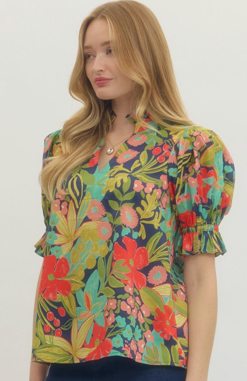 Floral print puff sleeve top featuring ruffled mock neck and V-neckline. Elasticated cuffs. Unlined. Woven. Non-sheer. Lightweight.