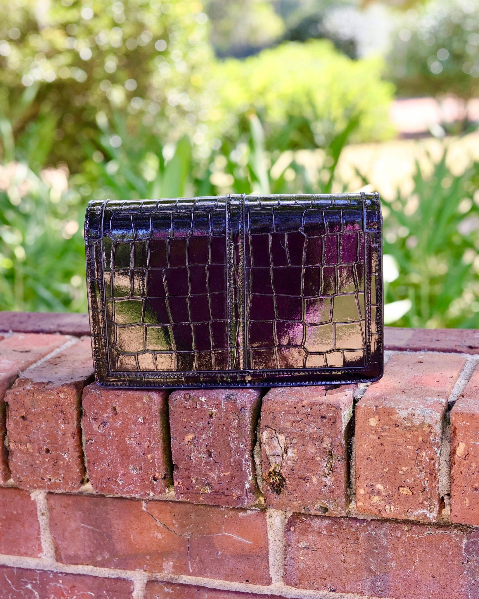 The Cecilia Circle Logo Handbag in Black Patent EC combines sleek style with practical design. Its embossed croc texture and boxy shape create a modern, fashionable look, while the fold-over design with a magnetic closure ensures secure access. Featuring a prominent Caroline Hill circular logo, this crossbody bag offers ample space for your daily essentials, making it an ideal accessory for both everyday wear and chic outings.