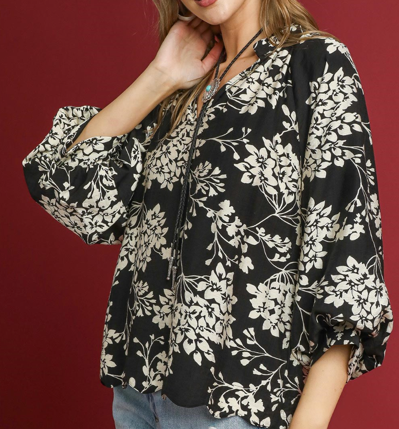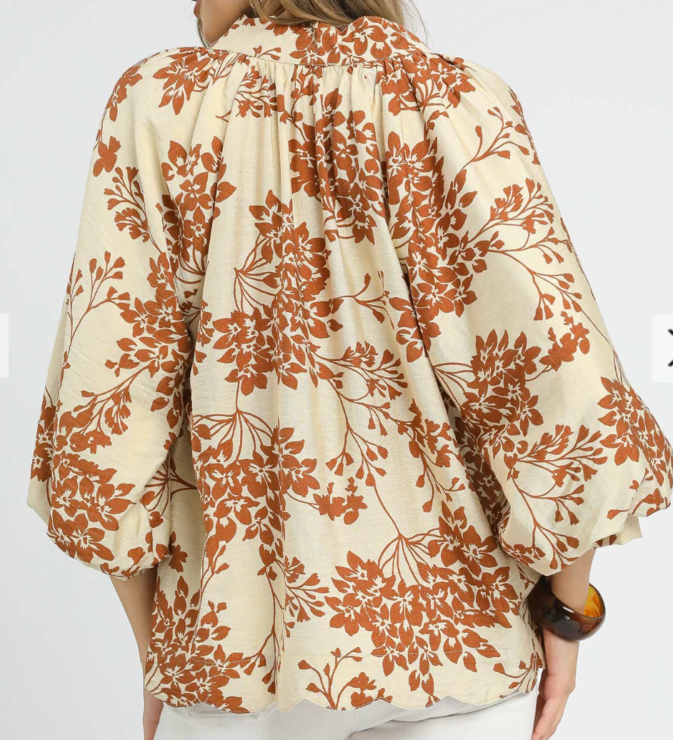 This beautifully designed top features a flattering V-neckline and elegant 3/4 balloon sleeves, creating a stylish silhouette that suits any occasion. Its relaxed, flowy fit ensures all-day comfort, while the scalloped hemline adds a delicate, feminine touch. Perfect for effortless chic, this piece combines comfort and style seamlessly.