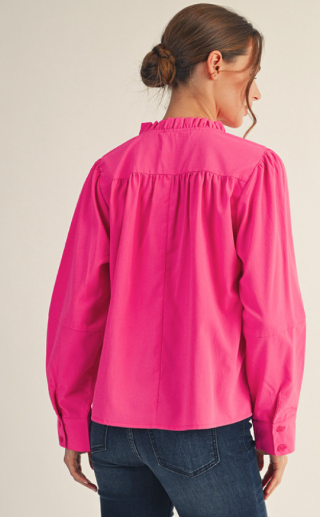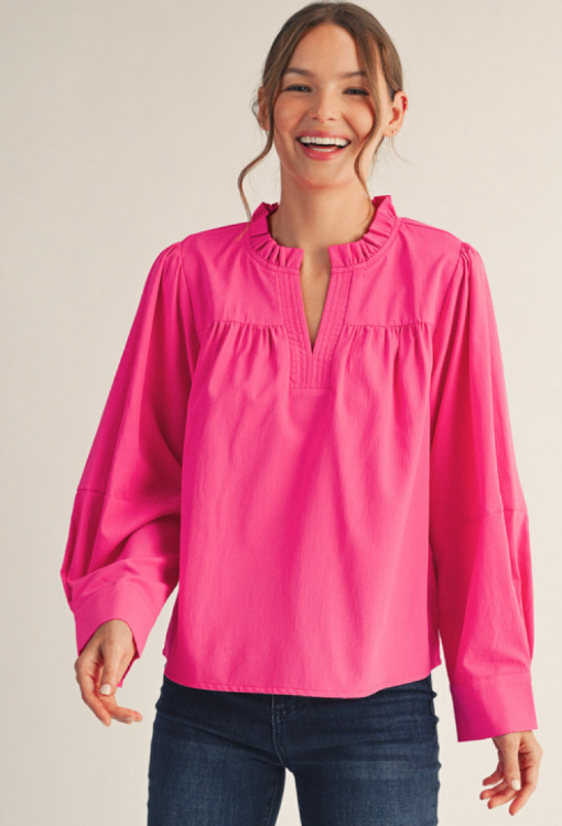 This long-sleeve top features a charming ruffled neckline and soft crinkled fabric that adds texture and style. Front and back shirring enhances the fit, while pleated sleeves bring a touch of elegance. Finished with button closure wrist cuffs, this piece combines comfort with sophisticated details, making it perfect for both casual and dressy occasions.