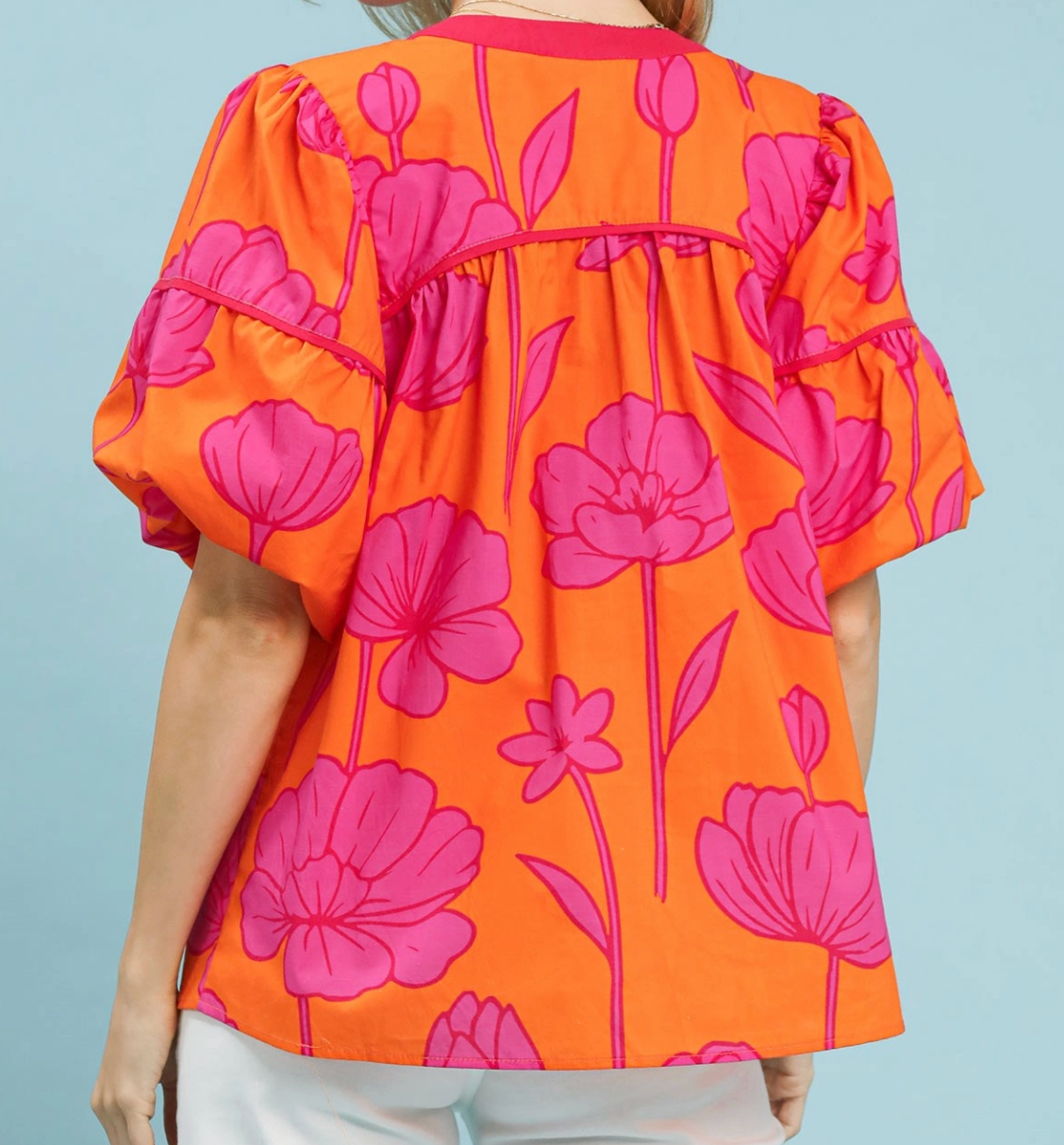 • V-neck with contrast trim• Short puff sleeves• Straight, relaxed hemline