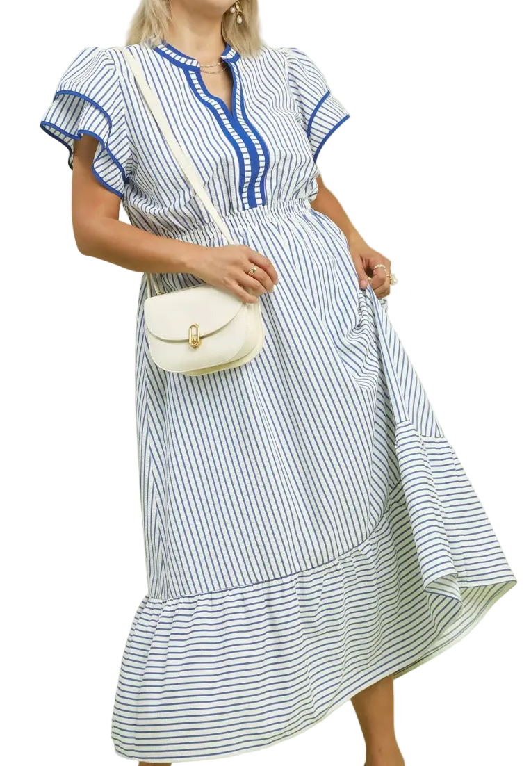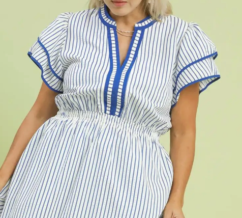 Effortless style meets comfort in this charming striped top. The elastic waist creates a flattering silhouette while flutter sleeves add a playful, feminine touch. A split neckline with contrast trim draws the eye and elevates your everyday look. Perfect for casual outings or dressing up with your favorite accessories, this versatile piece transitions seamlessly from day to night.