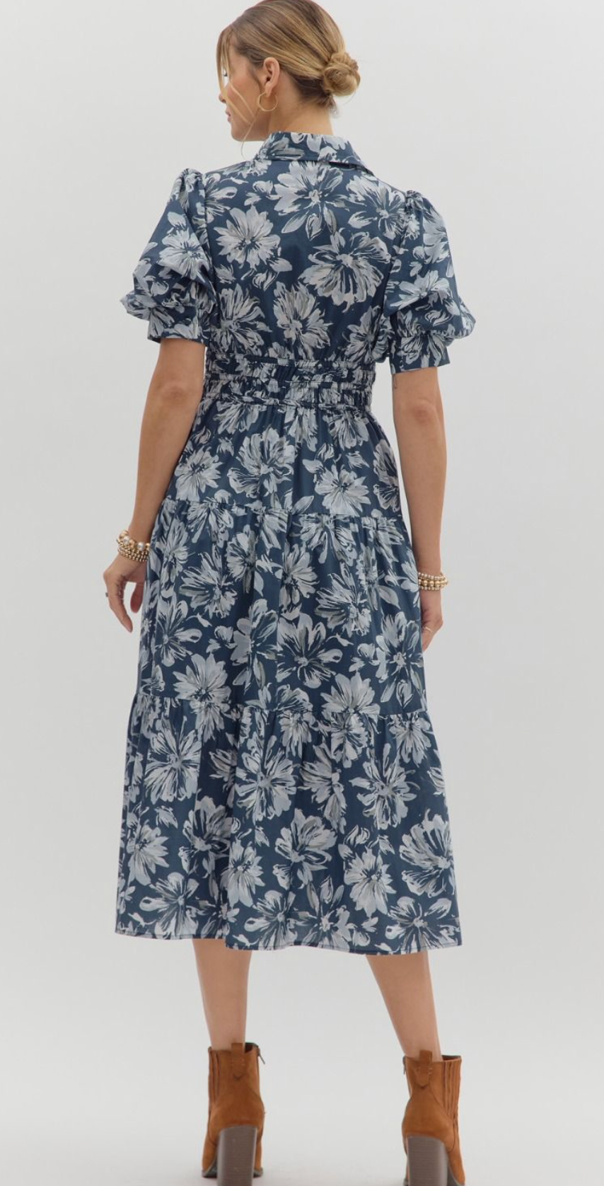 Embrace effortless elegance with the Fall Flowers Dress. Featuring a delicate floral print and short puff sleeves, this midi dress highlights a ruched waist with elasticated smocking for a flattering silhouette. The classic collar and button-front closure add timeless charm, while side pockets offer practical convenience. Crafted from lightweight, non-sheer 100% cotton and fully lined, it ensures all-day comfort and quality. Perfect for any occasion, this dress blends feminine style with breathable comfort seamlessly.