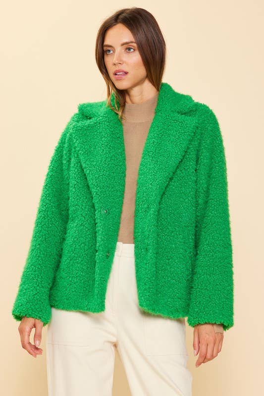 Faux fur sherpa jacket Cozy up in style with this Faux Fur Sherpa Jacket, crafted from plush faux fur for a soft, luxurious feel. Designed with a relaxed fit and warm lining, it’s the perfect layering piece to keep you chic and comfortable on cooler days. Model is: Height: 5'8 1/2 Bust: 32" Waist: 24" Hip: 34 | Model wears size small.