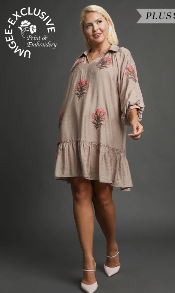 • V-neck • Ruffled tiered hem • Embroidered dress • Single flower stem • Lined