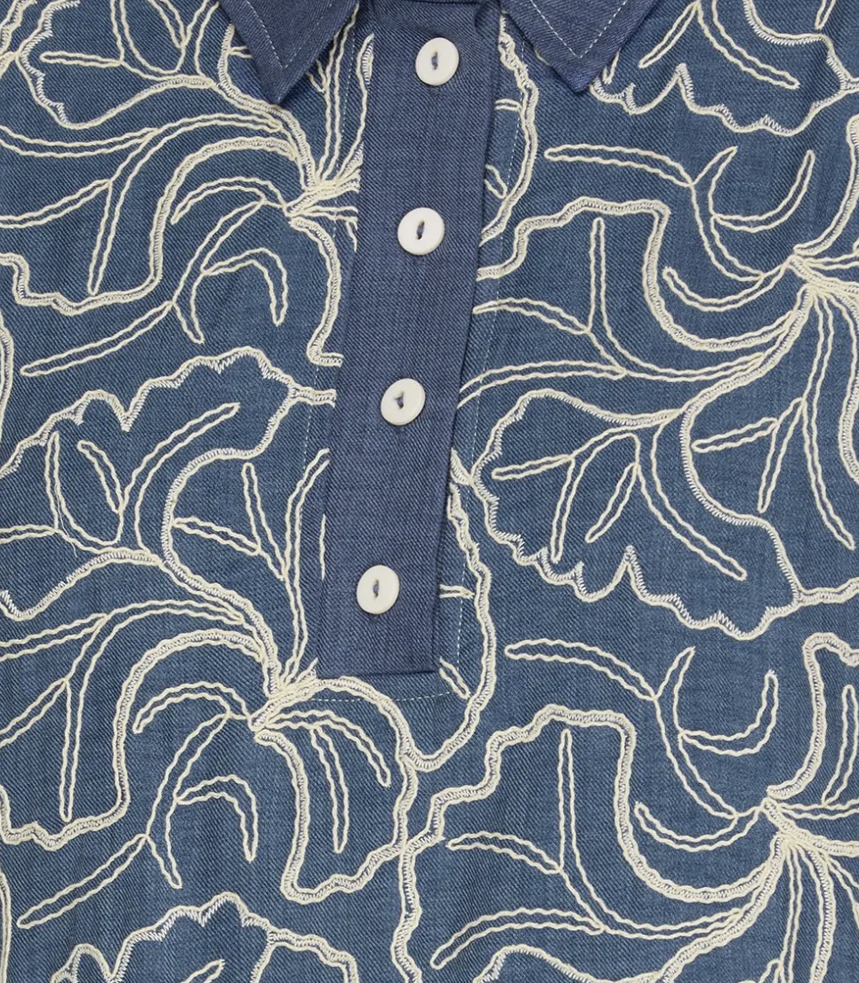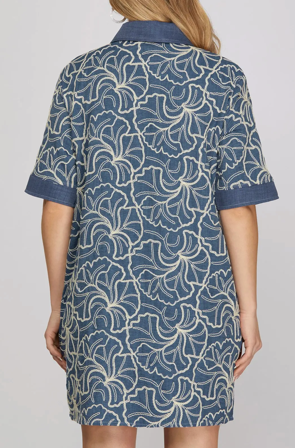 Polished meets effortless in this embroidered mini dress designed with a classic collared neckline and sporty-chic button detail. Featuring a rich blue base with intricate embroidered florals, this dress offers a timeless yet modern look. The relaxed shift silhouette and half sleeves provide comfortable coverage, while side pockets add everyday functionality. Lightweight and easy to wear, it’s perfect for work, weekends, or wherever the day takes you.