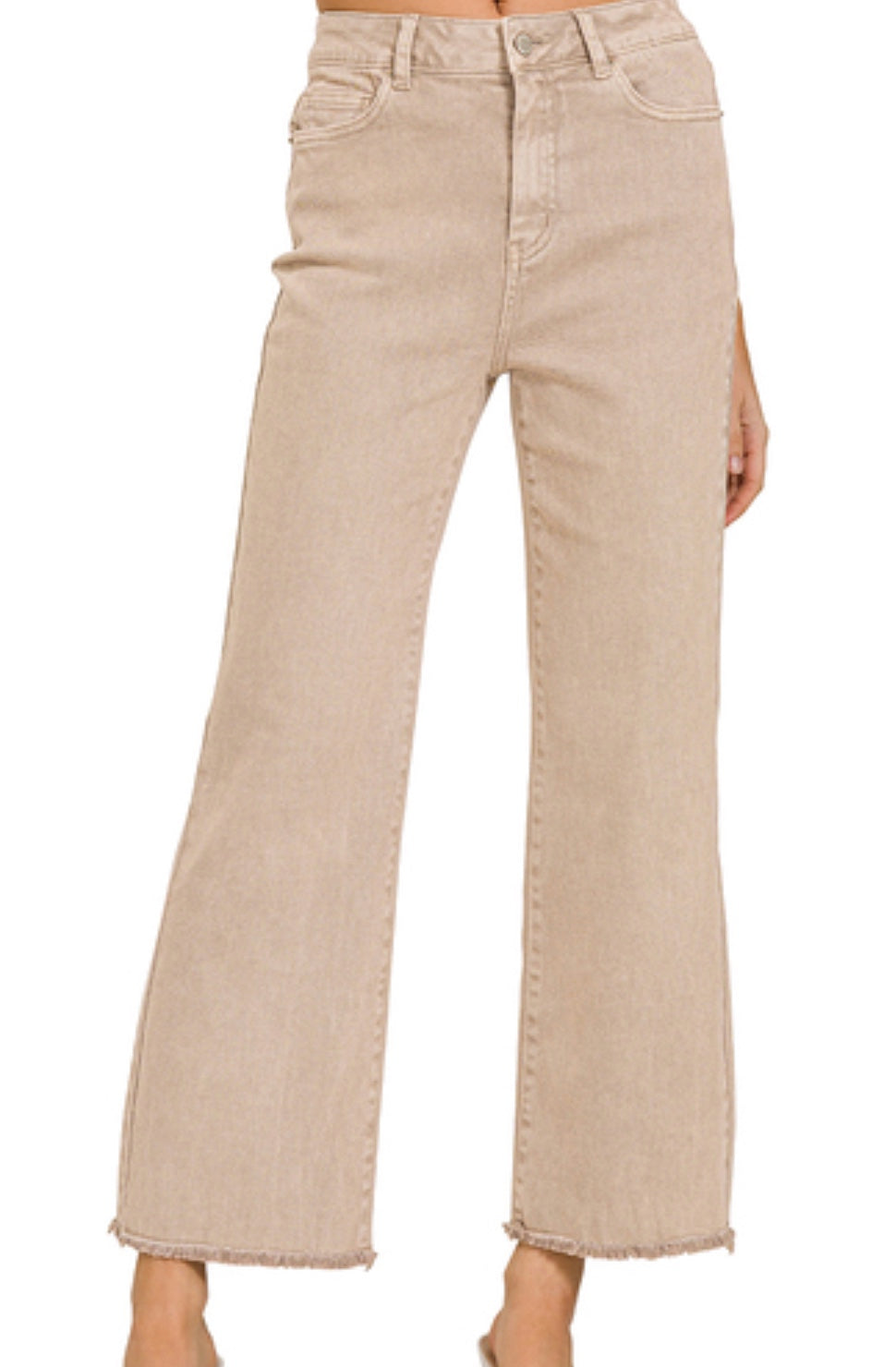 These acid-washed high waist bootcut pants offer a flattering fit with a comfortable stretch fabric. Featuring a trendy frayed hem, a front rise of approximately 10.75", and a 27" inseam, they balance style and comfort. The 19.5" leg opening completes the look.