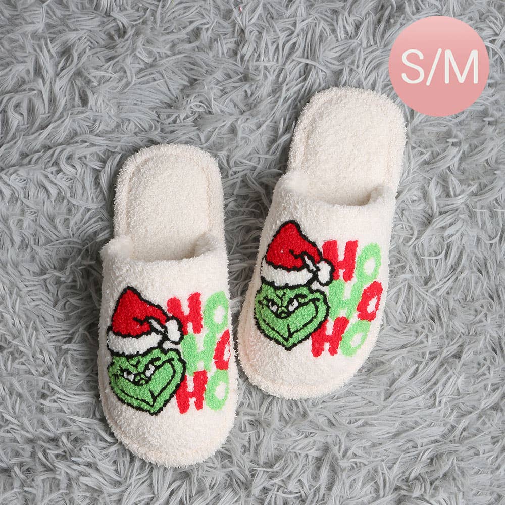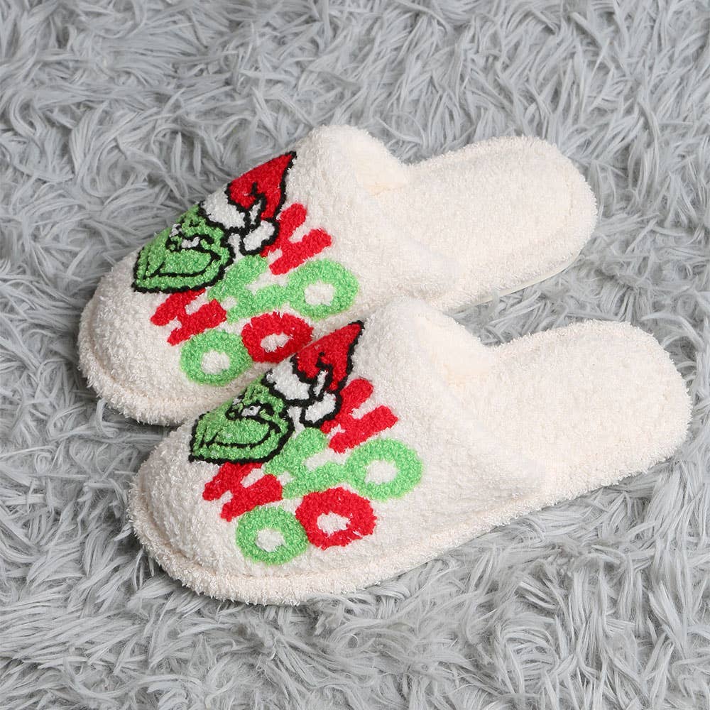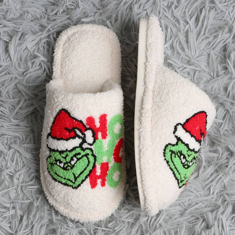 Step into the holiday spirit with these playful indoor slippers featuring a bold “Ho Ho Ho” message and a mischievous Santa-inspired character. Designed for cozy lounging, they bring fun, warmth, and seasonal cheer to your at-home footwear collection all winter long.