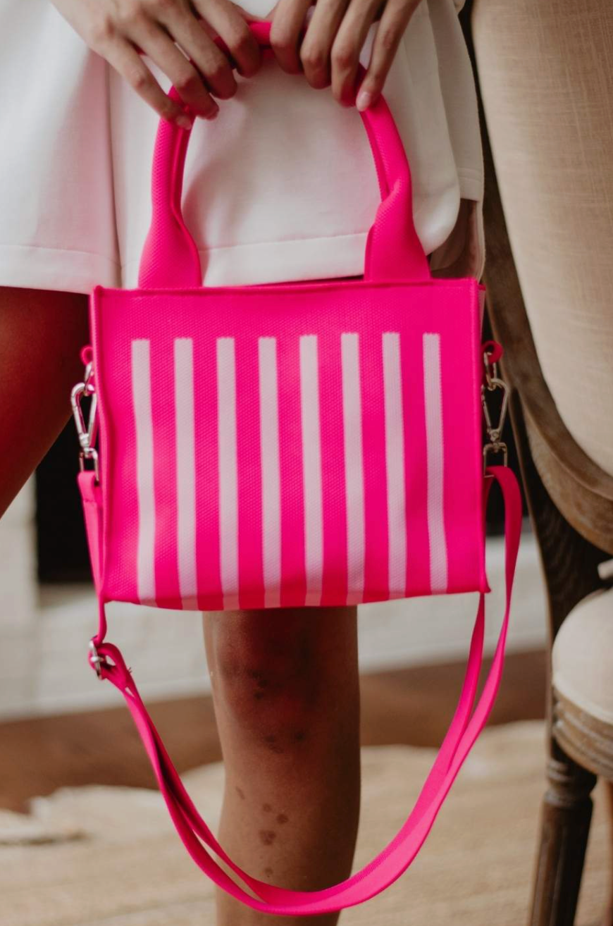 The Hot Pink Striped Canvas Tote Bag is the perfect striped handbag for women who want versatility and style. Made from durable canvas with a bold two-tone stripe, this women's tote features a secure zipper closure and a removable adjustable shoulder strap for crossbody or handheld styling. Lightweight yet structured, it is ideal for everyday use, vacation shopping, and trendy seasonal assortments. Easy to merchandise within resortwear, travel accessories, and everyday purse collections. Stock up on new canvas tote bags for women today!