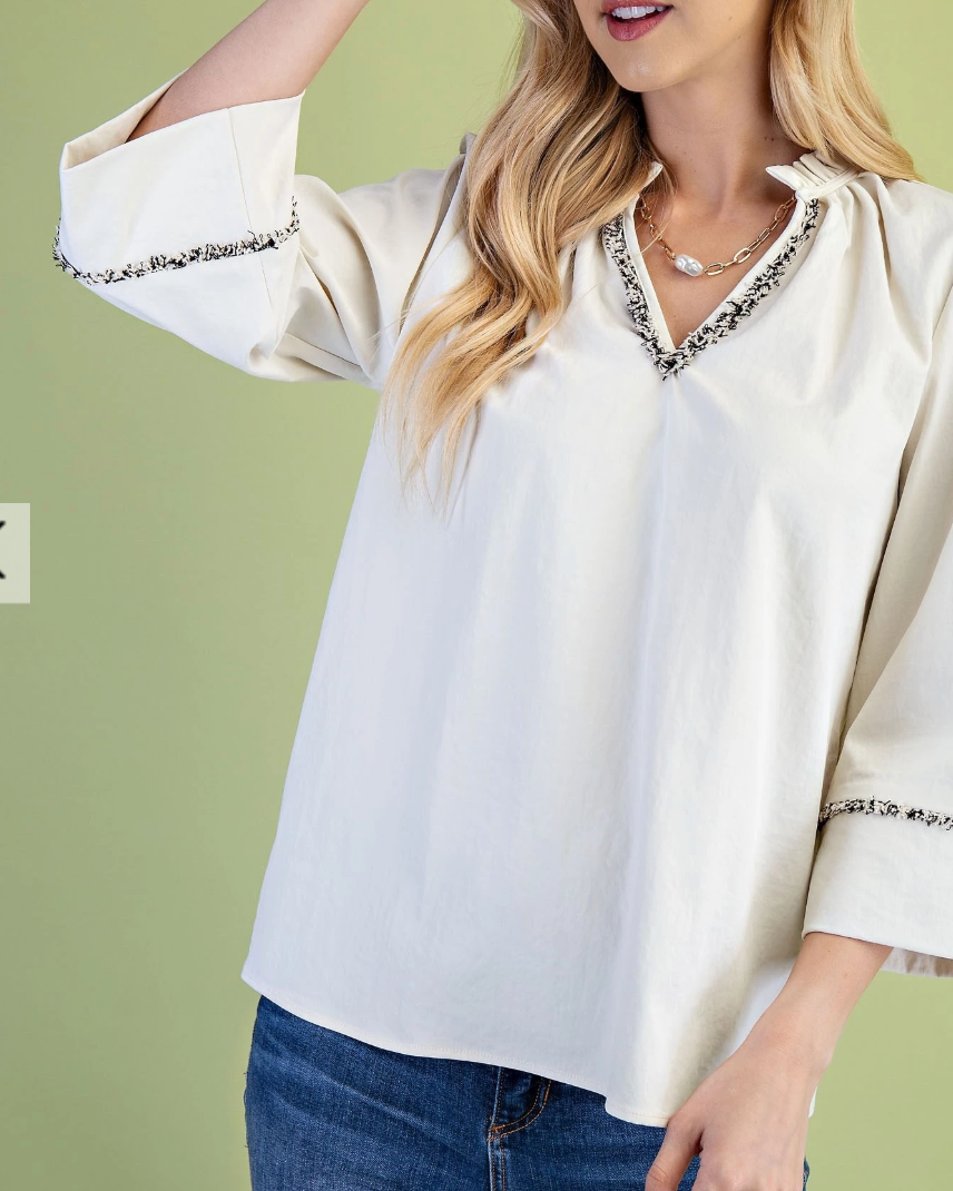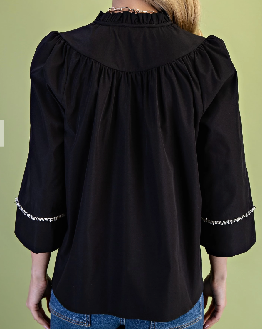Elevate your wardrobe with this ruffled neck blouse featuring elegant 3/4 length wide sleeves that offer both comfort and style. The delicate frayed fringe trim adds unique texture and a modern touch, making it perfect for dressing up or down. Lightweight and breathable, this blouse effortlessly blends sophistication with a relaxed fit, ensuring you feel confident and chic throughout your day.