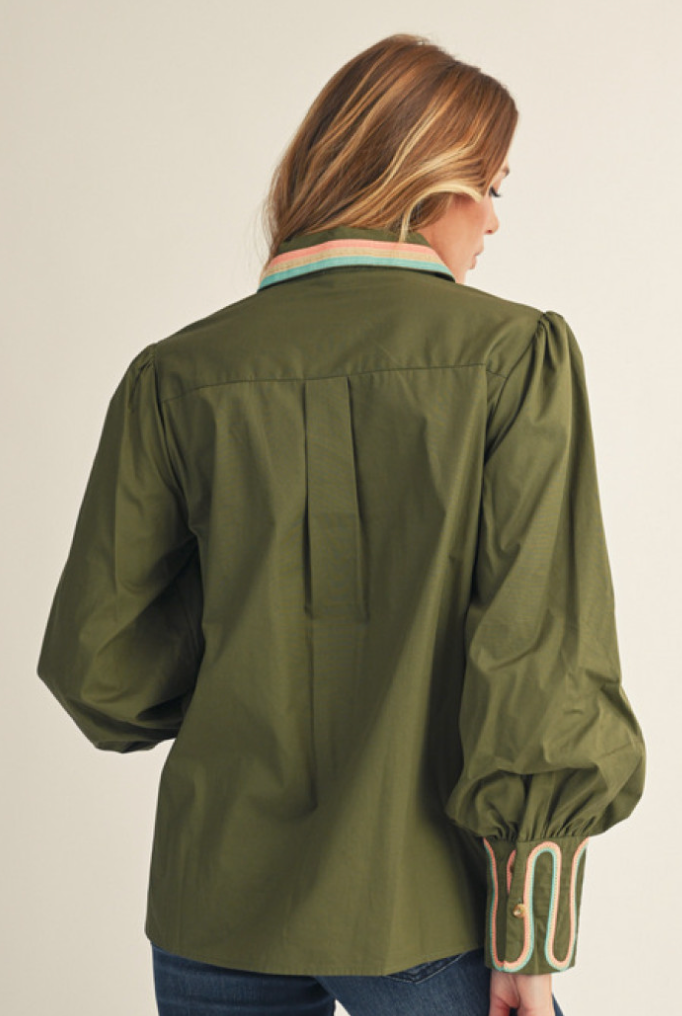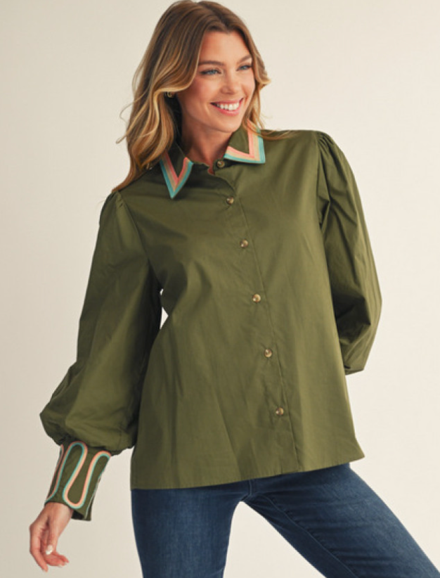 Long puff sleeves button down solid shirt with embroidery accent, wide cuff detail.