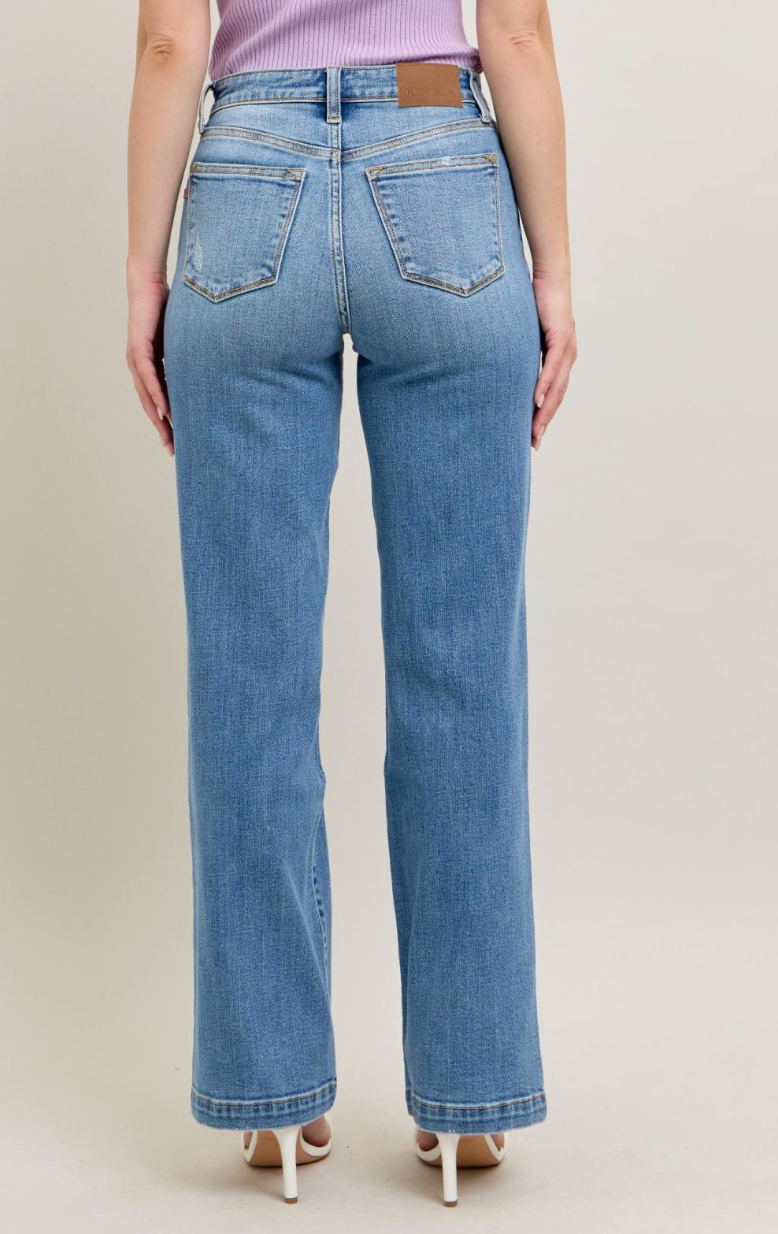 Experience comfort and style with the Judy Blue Straight Fit trousers. Crafted from a soft blend of cotton, rayon, polyester, and a touch of spandex, these pants offer just the right amount of stretch for all-day wear. Featuring a high waist with a 10 1/2" rise and a 33" inseam, they provide a flattering straight fit that effortlessly enhances your silhouette. Perfect for both casual and professional settings, these trousers combine durability with a sleek look to elevate any outfit.