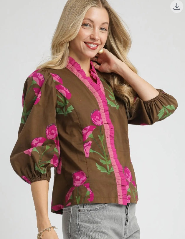 Floral Print • Split V-neck• 3/4 puff sleeves • Straight hem• Contrast hem• Not Lined