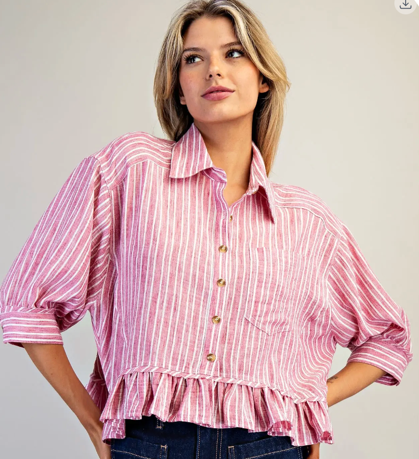 This top features a classic collared neckline and button front closure, drop shoulders and relaxed 3/4 sleeves with button tab cuffs, a single chest pocket, vertical stripe pattern throughout, and a cropped, boxy silhouette finished with a playful ruffled hem for a breezy, feminine touch.