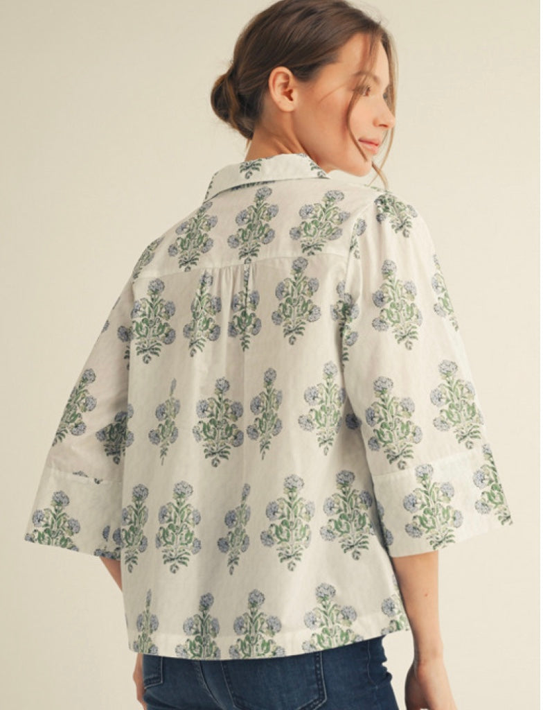 3/4 sleeves floral top with stripe contrast, collared v neckline.