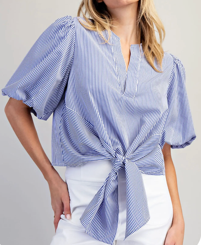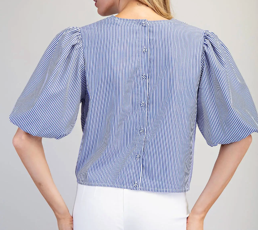 Striped Button Down Back Tie Front Blouse ✨Product Detail:This striped blouse features a cropped length with gathered shoulders, voluminous puff sleeves, a split neckline with a tie front detail, and a button down back closure for a playful yet polished look.