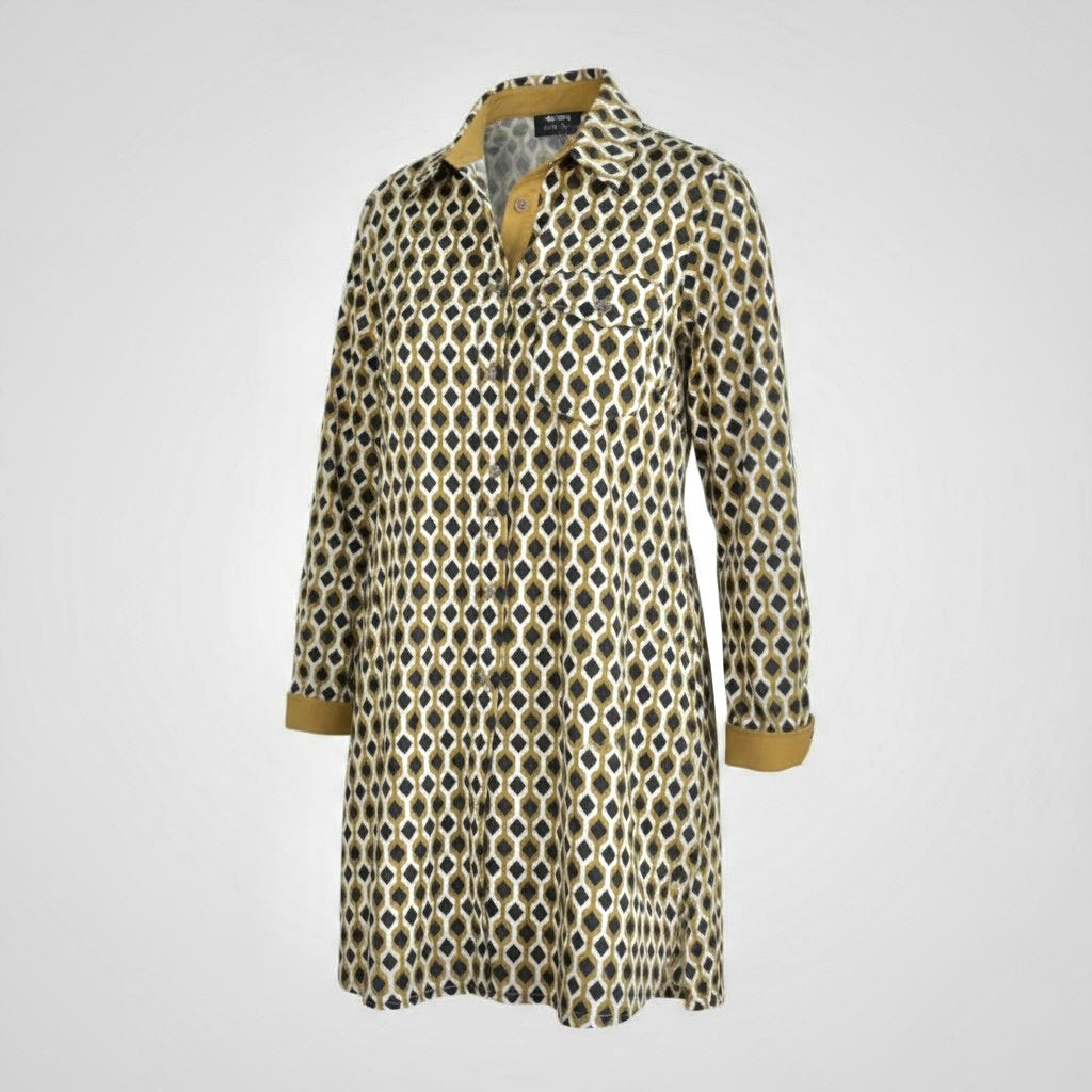 Long sleeves button down geo prints shirt dress with side pockets, solid contrast detail.