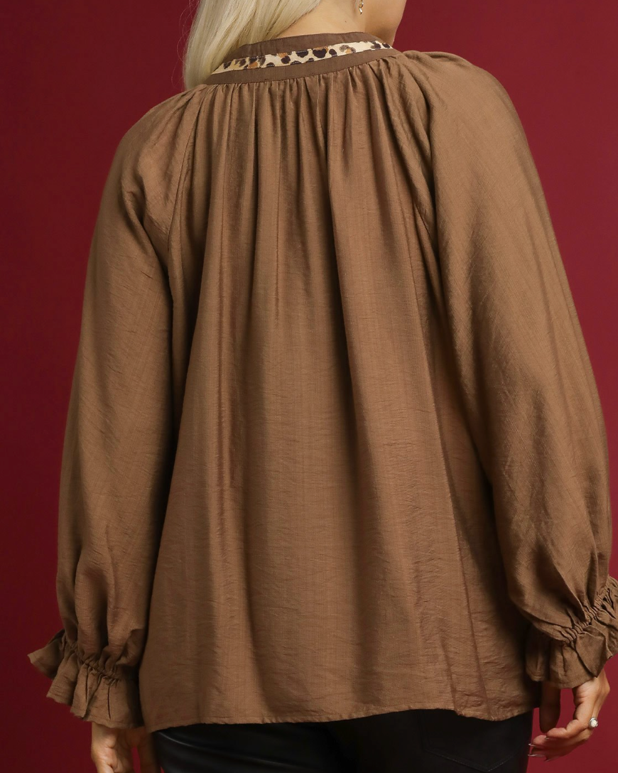 Elevate your wardrobe with this chic top featuring a flattering V-neck and eye-catching contrast leopard detail framed by elegant brown trim. Designed with long sleeves and a relaxed silhouette, it offers both comfort and style for any occasion. Embrace effortless sophistication that moves with you throughout the day.