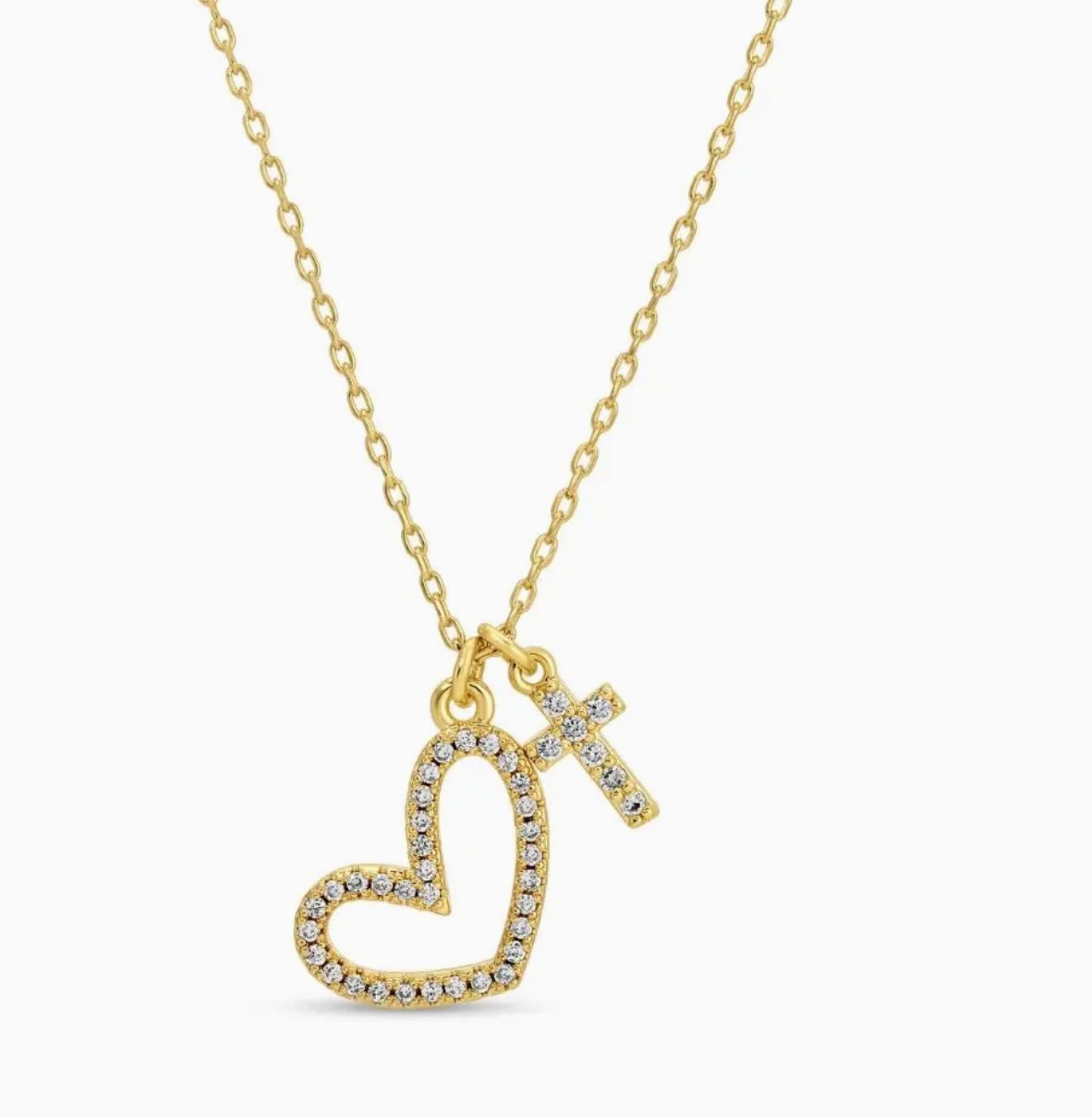 Embrace a beautiful blend of faith and love with the Pavé Heart and Cross Pendant Necklace, a radiant piece designed to inspire and uplift. Crafted with an 18k gold plating finish or a sleek, silver-toned rhodium plating, this necklace features two delicate charms encrusted with shimmering cubic zirconia stones. The open-heart silhouette and petite cross charm hang gracefully together from a dainty link chain, catching the light with every movement to provide a sophisticated, multi-dimensional sparkle. Whether you are looking for a meaningful gift for a religious milestone or a dainty accessory that reflects your personal values, this spiritual pendant necklace offers timeless elegance and a versatile shine that effortlessly elevates any ensemble. Product Details 18" Necklace + 2" Extension .45" x .65" and .2" x .4" Cubic Zirconia Pendants 18k Gold or Rhodium Plated Brass Base