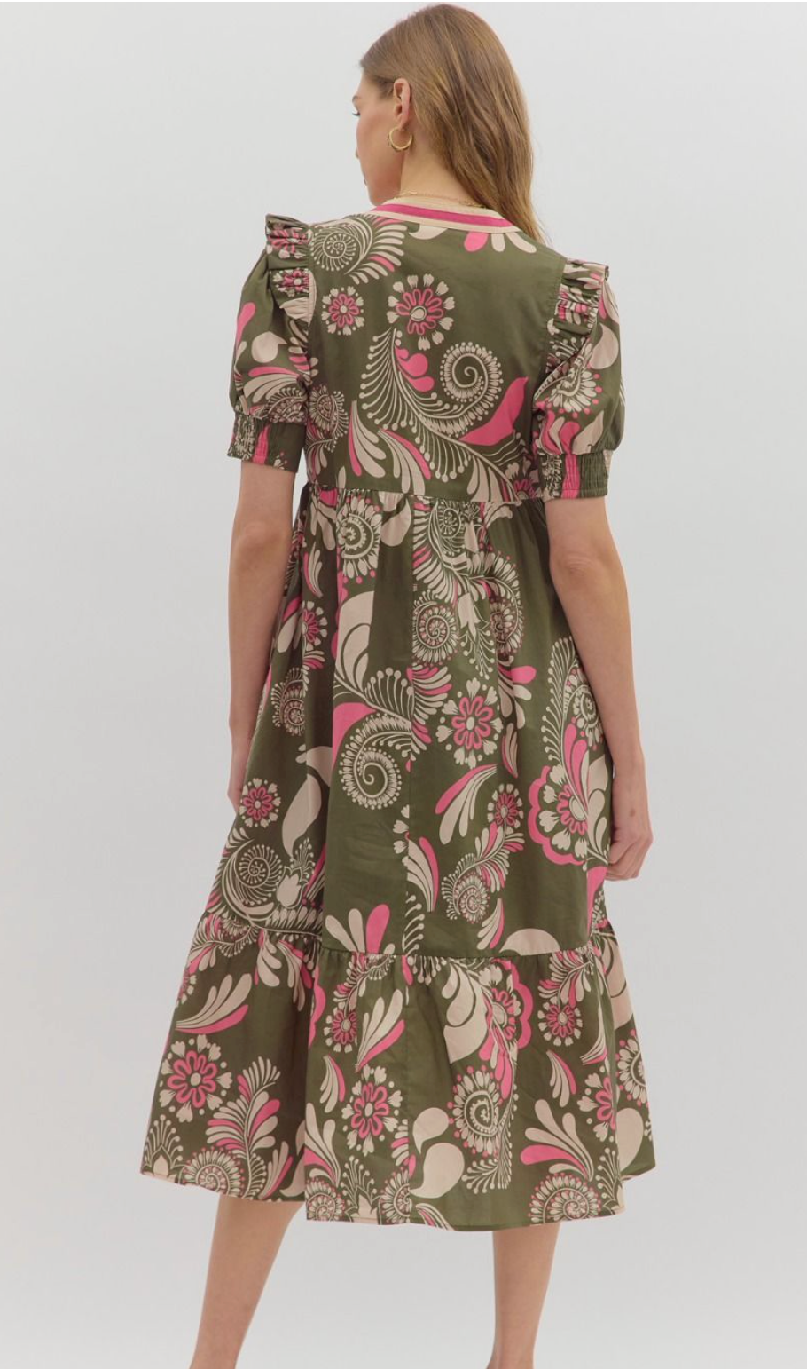 Embrace effortless style with this Pink Paisley Dress, featuring a flattering V-neck and smocked cuff band sleeves for a comfortable fit. The tiered midi silhouette adds a playful touch, while side pockets offer practical convenience. Crafted from lightweight, 100% cotton woven fabric, this lined dress is breathable and non-sheer, perfect for warm days. Elevate your wardrobe with this versatile, eye-catching piece that combines comfort and charm.