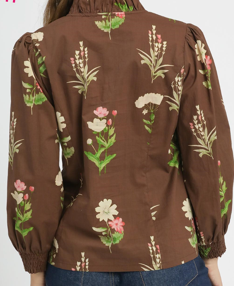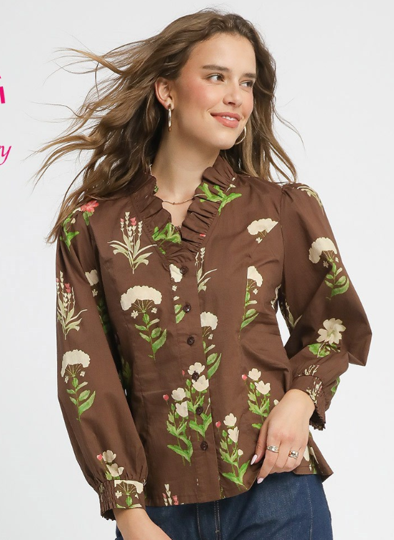 This feminine top features a charming button-front closure and a delicate ruffled neck, enhanced by a vibrant floral print. Designed to elevate your everyday look, it combines effortless style with a flattering fit, making it perfect for any occasion.