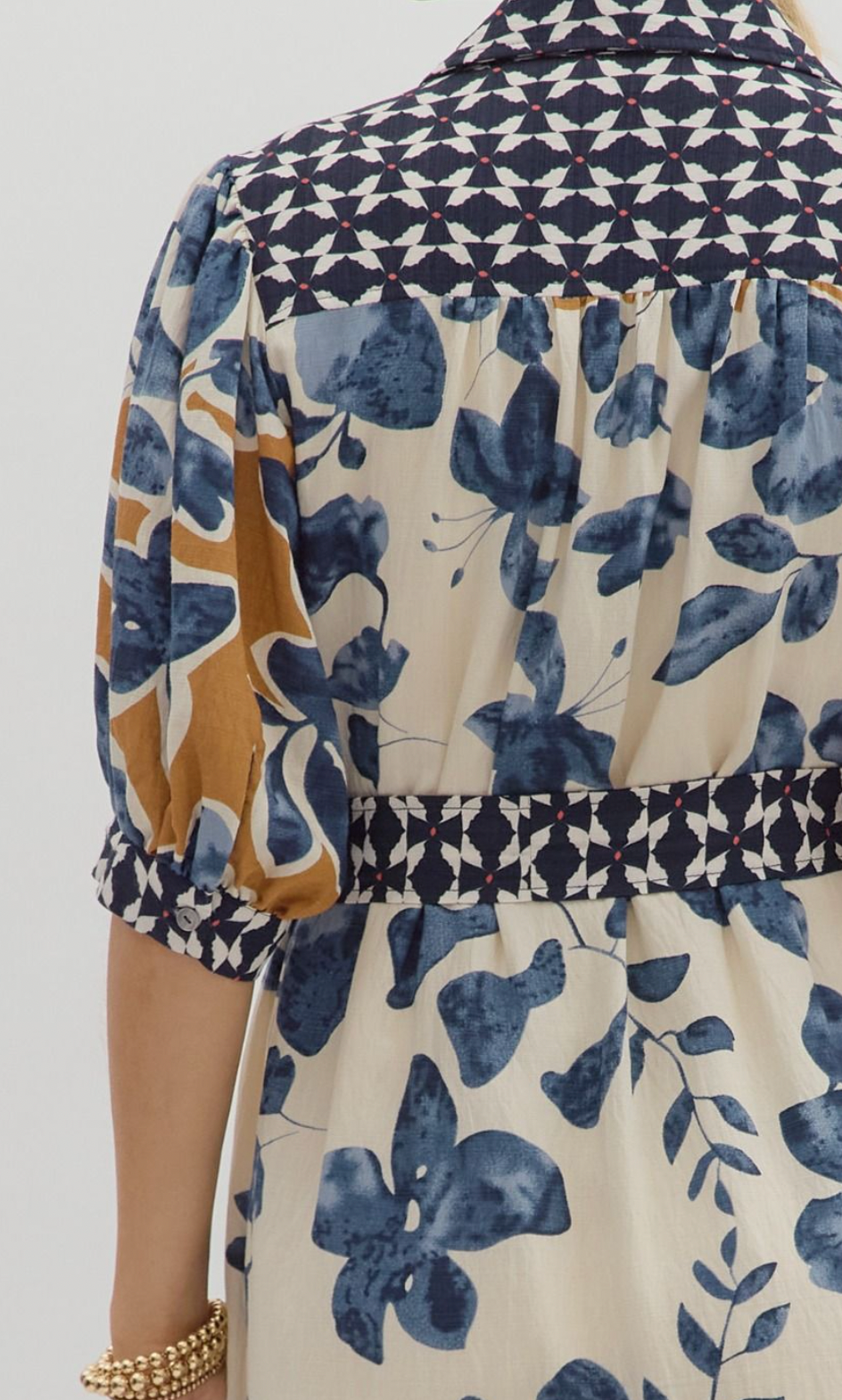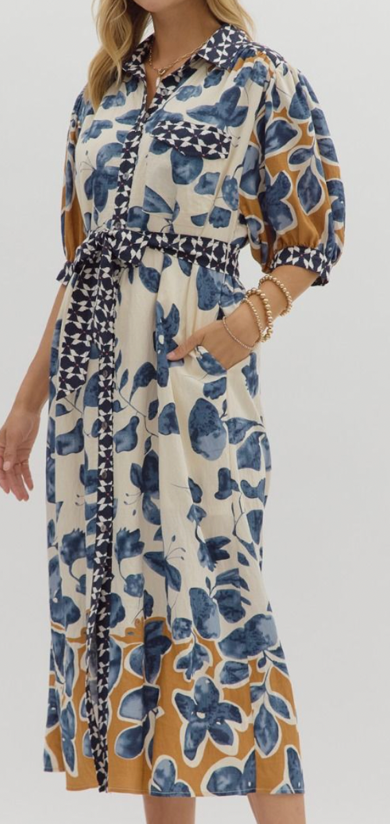 The Salone Dress combines elegance and comfort with its botanical print and lightweight woven fabric. Featuring a flattering ¾ sleeve midi length, an abstract contrast band collar, and a button-front design, it offers versatile style for any occasion. The removable belt cinches the waist for a tailored fit, while side pockets add practical convenience. Fully lined and non-sheer, this dress ensures confidence and ease throughout your day.
