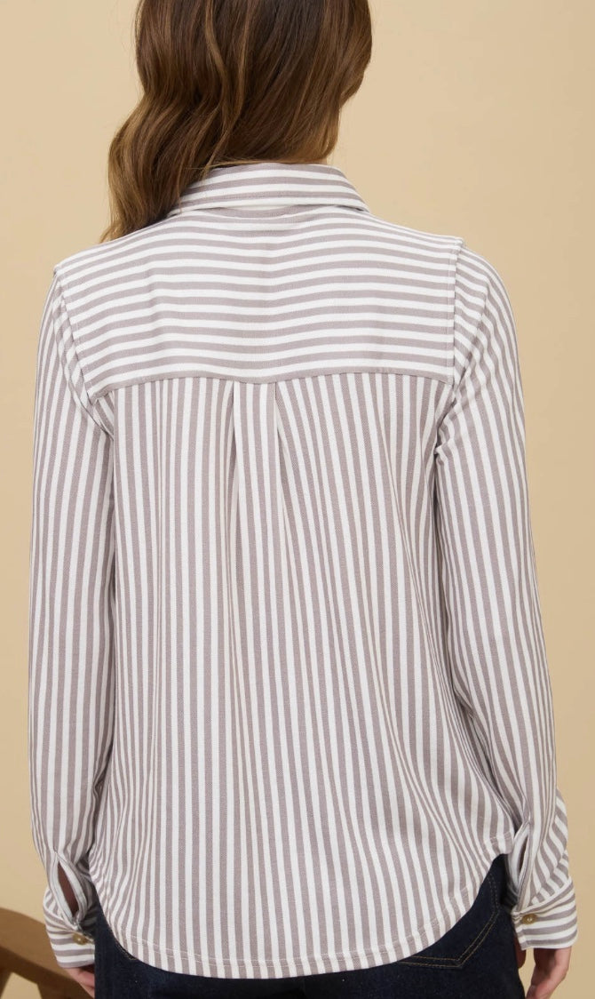 COLLARED BUTTON DOWN LONG SLEEVES POCKETS STRIPE PATTERN KNITWEAR NOT LINED 63% POLYESTER 34% RAYON 3% SPANDEX