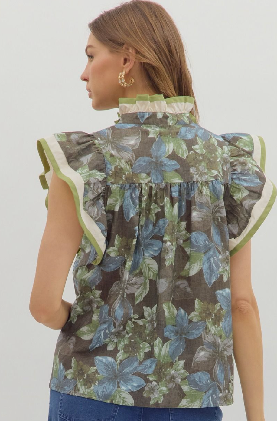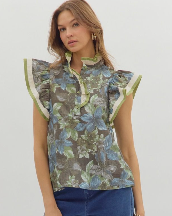 This lightweight woven top features a vibrant floral print with multicolor contrast accents and charming ruffle details along flutter sleeves. The ruffle band collar and front button closure add a feminine touch while ensuring a comfortable fit. Unlined and non-sheer, it offers breathable wear perfect for warm days. Elevate your wardrobe with this effortlessly stylish piece that combines playful design and easy elegance.